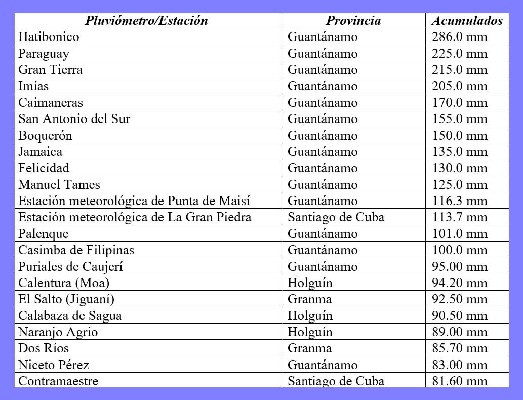 La proximidad de este sistema al territorio nacional en combinación con los factores locales y orográficos incentivaron la ocurrencia de numerosos chubascos, lluvias y tormentas eléctricas en la región oriental, con acumulados de precipitación en veinticuatro horas que han resultado significativos. Hasta este momento se reportan un total de 22 pluviómetros con acumulados superiores a los 80.0 milímetros, en 14 localidades se superaron los 100 milímetros, y de ellos, cuatro pluviómetros sobrepasaron los 200 milímetros de lluvia en la provincia de Guantánamo.