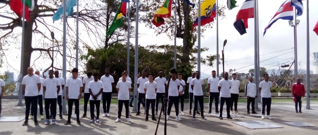 Jonathan Hernández Lafferté, Capitán del equipo, acompañado de Iduán Martínez Soto y Harold Aguilera recibieron la enseña nacional de manos del Embajador cubano y de Pedro José Infante Aparicio, también Primer Vicepresidente de la Federación Venezolana de Fútbol.
