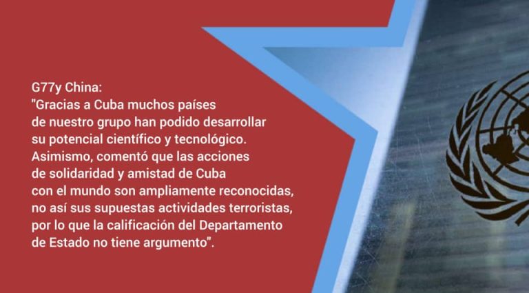 En nombre del G77 y China también exhortó a que Cuba sea eliminada de la lista de países patrocinadores del terrorismo. "Gracias a Cuba, muchos países de nuestro grupo han podido desarrollar su potencial científico y tecnológico", subrayó.
