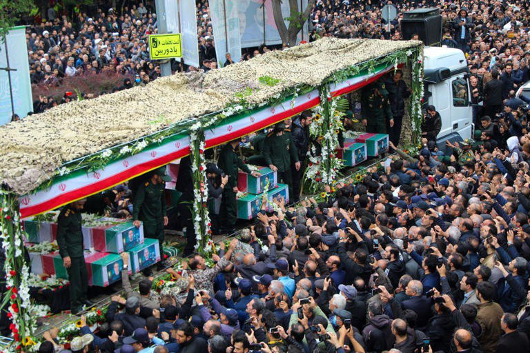 Los ocho féretros, cubiertos con la bandera iraní, fueron trasladados posteriormente a un aeropuerto de Teherán, la capital, para ser llevados a la ciudad santa de Qoms, donde está prevista otra ceremonia por la tarde.