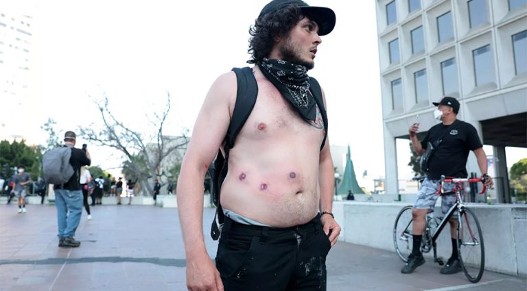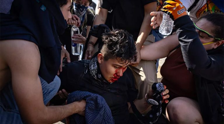 “Una falange de policías a caballo rodea a una persona que ha sido derribada al suelo y golpeada repetidamente con porras. Una reportera de televisión australiana hace un gesto de dolor cuando una bala de goma le dispara mientras finaliza una transmisión en vivo”, publicó Los Angeles Times.