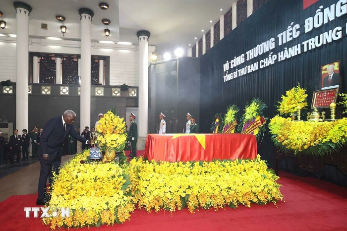 En primer lugar, le traslado las más sentidas condolencias, en nombre del General de Ejército Raúl Castro Ruz, y del Primer Secretario del Comité Central del Partido y Presidente de la República Miguel Díaz-Canel Bermúdez, y de todo el pueblo cubano, ante la lamentable noticia del fallecimiento del Secretario General del Partido Comunista de Vietnam, Nguyen Phu Trong.