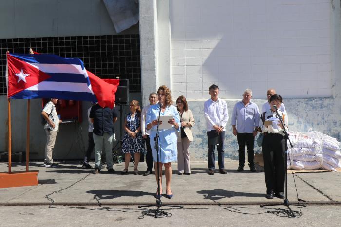 «En nombre del Gobierno y el pueblo cubanos deseo reiterar el profundo agradecimiento por este donativo, que ha llegado en un momento muy oportuno, en medio del complejo escenario que vive el país, por la ilegal y cruel política de guerra y persecución económica del Gobierno de los Estados Unidos», afirmó Betsy Díaz Velázquez, ministra de Comercio Interior, en el acto de recepción, realizado este sábado en la terminal Haiphong del puerto de La Habana.