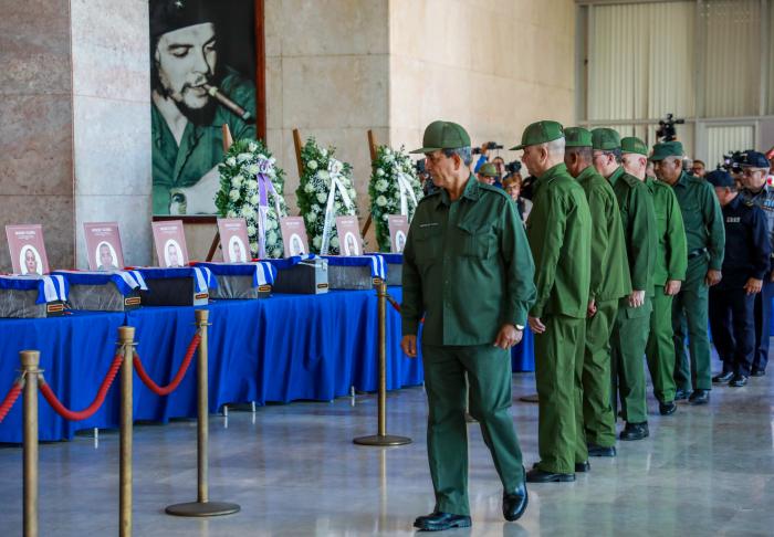 En el vestíbulo del Ministerio de las Fuerzas Armadas Revolucionarias (Minfar) los 32 féretros con banderas cubanas y las fotos que identifican los restos, reciben el tributo del pueblo que, en silencio, acude con visibles muestras de dolor.