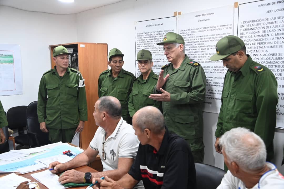Díaz-Canel indagó sobre los planes de aviso, por los sistemas para garantizar la movilización, y la ubicación en la defensa de los habitantes de la zona y otras tareas planificadas.