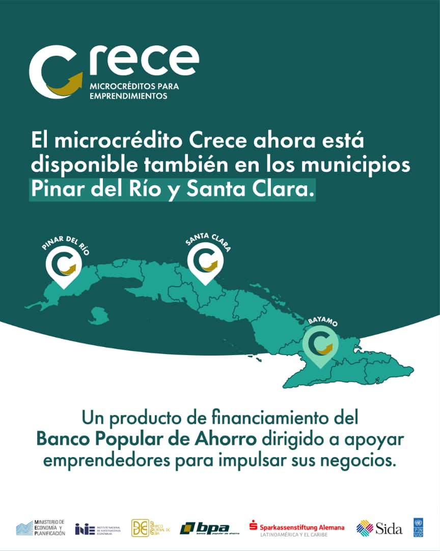 De manera oficial se lanzó en la provincia de Villa Clara el microcrédito Crece, un producto financiado por el Banco Popular de Ahorro, y diseñado de conjunto con el Banco Central de Cuba (BCC), los gobiernos territoriales y el Programa de las Naciones Unidas para el Desarrollo (PNUD), con la asistencia técnica de la Fundación de las Cajas de Ahorro Alemana.
